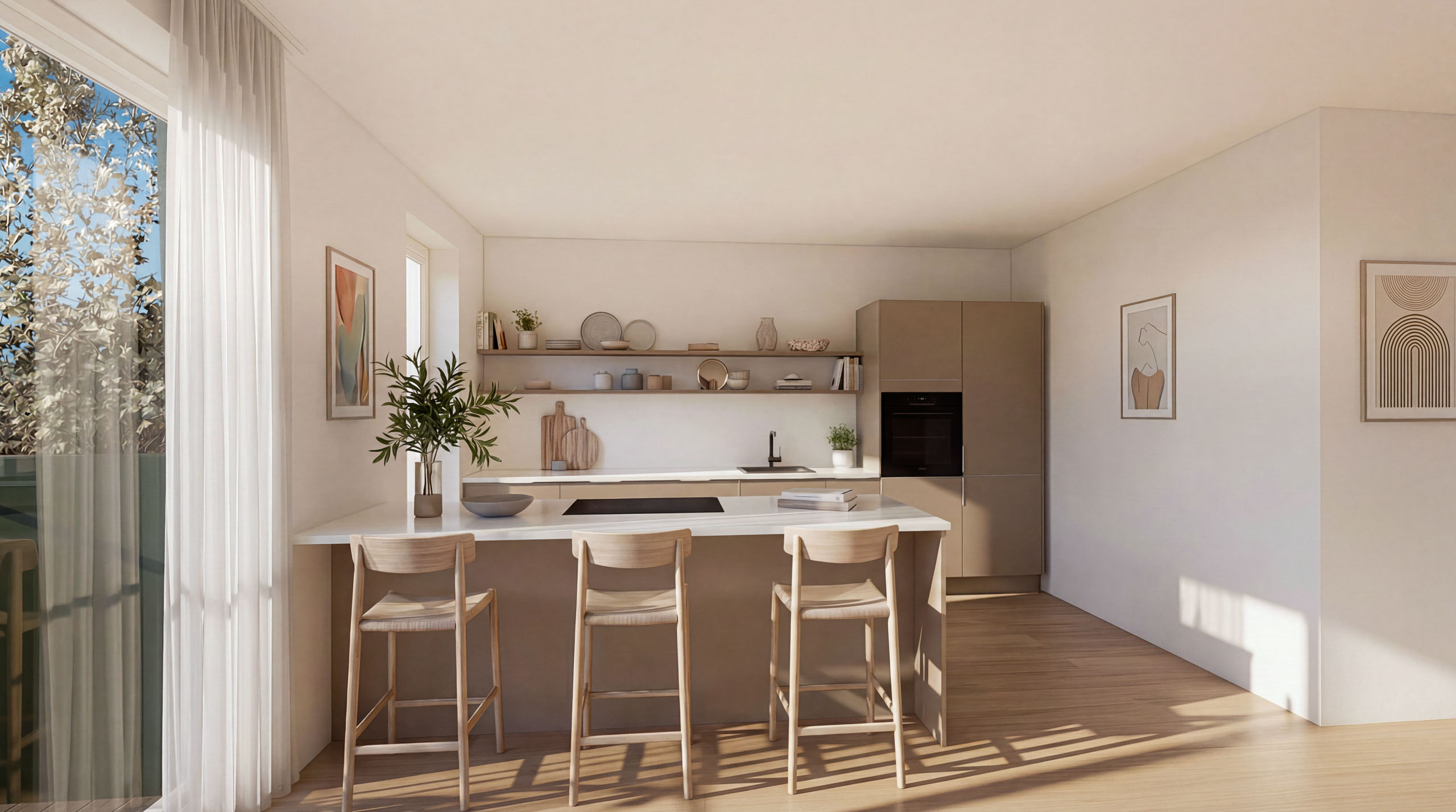 Kjøkkenet leveres fra Strai Kjøkken, en lokal produsent kjent for håndverkskvalitet og tidløs design. Modellen Dalen er standard i alle leiligheter, med fem stilrene fronter å velge mellom: Light Lakeland Acacia, Pearl Grey, Premium White, Taupe og Sand. Et godt utvalg av benkeplater, downlights og hvitevarer er inkludert, detaljer som mange utbyggere ofte velger å ta som tillegg.